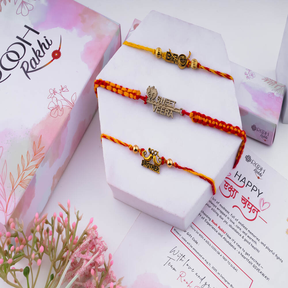 Delivered in a stylish Rooh Rakhi box with rakhi greetings card, this rakhi set of 3 is such a modern twist on the traditional rakhi gift!