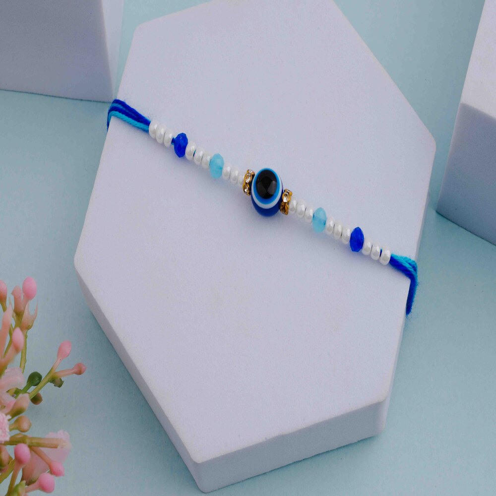 A gorgeous handcrafted Evil Eye Rakhi for brother or sister to protect him/her this Rakhi 2025. The vibrant blue threads, pearl-like beads, and signature evil eye designs offer both tradition and style. This evil eye rakhi is sure to protect your brother from negativity while bringing immediate style to the wrist.